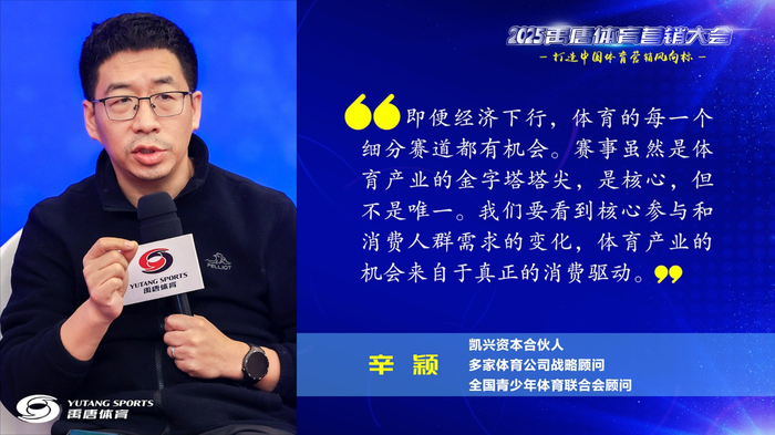 过去我们习惯说的是找风口,其实更应该是找主场。即便经济下行,体育的每一个细分赛道都有机会。赛事虽然是体育产业的金字塔塔尖,是核心,但不是唯一。我们要看到核心参与和消费人群需求的变化,体育产业的机会来自于真正的消费驱动。
