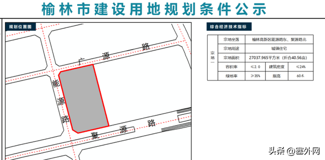宗地一坐落于榆林高新区能源路东、聚源路北,面积27037.965平方米(折合40.56亩),用途城镇住宅,容积率≤2.0,建筑密度≤24%,绿地率≥35%,建筑限高60米。