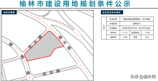 宗地二坐落于榆林高新区能源路东、民兴路南,面积25284.978平方米(折合37.93亩),用途城镇住宅,容积率≤2.0,建筑密度≤24%,绿地率≥35%,建筑限高60米。