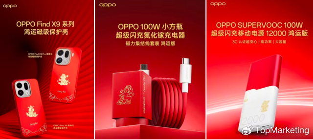 契合新年氛围,OPPO马年限定款以红色和金色为主色调,设计上设计融入生肖马元素。比如,售价99元的OPPO Find X9 鸿运磁吸保护壳推出财神马、收款马两种规格;售价229 元的OPPO 100W 小方瓶超级闪充氮化镓充电器也是喜庆的红色,这款产品还升级了第三方手机充电性能,30 分钟可为 iPhone17 充进约 62% 电量; 售价249 元的OPPO SUPERVOOC 100W 超级闪充移动电源 12000鸿运版不仅有3C 认证,双口均支持超级闪充。