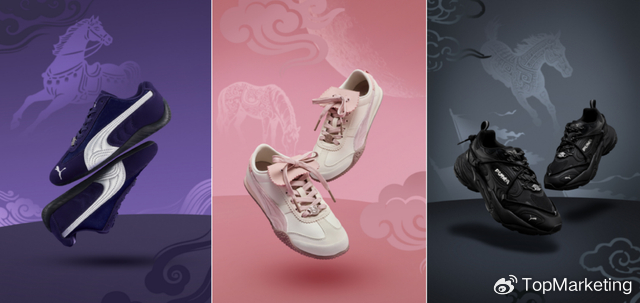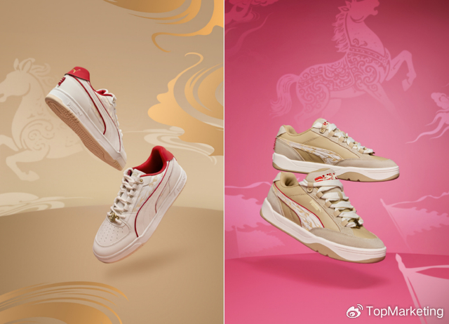 PUMA将Forever Faster的品牌精神与中国传统马年相结合,推出「彪足马力」系列,覆盖鞋履、服饰等品类。其中鞋履以中国历史传奇人物坐骑为配色和设计灵感,推出“五骏迎春”新春单品:SPEEDCAT 以飒露紫为灵感,BELLA UT以玉狮子的温润粉色为主色调,PARK LIFESTYLE融合了赤兔的金棕色的赤金色纹理,CAVEN III提炼了黄骠马的金缎色,RS LITE使用了乌骓的墨色中。五匹骏马,开启新程。