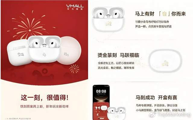 HUAWEI FreeBuds Pro 5马年典藏版,将烫金篆刻小金马与呼吸灯融合,开盖还有专属弹窗动画。1499元的售价,对比苹果AirPods Pro 3马年特别款确实更有性价比。