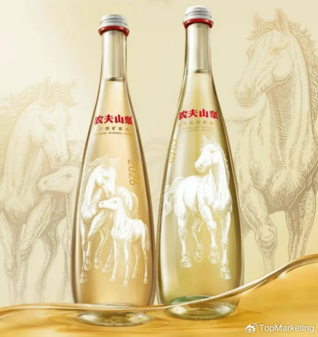 自2016年猴年起,农夫山泉每年都会推出生肖典藏玻璃瓶水。「丙午马年典藏版」玻璃瓶天然矿泉水于2025年12月1日发布。马年生肖水瓶身以浮雕工艺和手绘刻画了奔腾的骏马形态,推出“双马依偎”、“单马驰骋”两款设计。