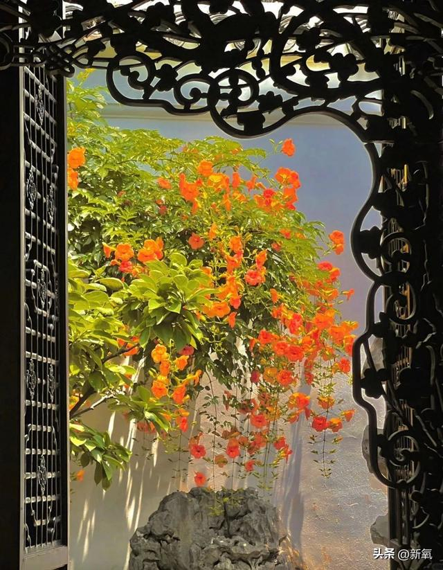 而苏轼笔下那句“翠飐红轻,时上凌霄百尺英”,在被景窗框住的橙黄凌霄花上被具象化了