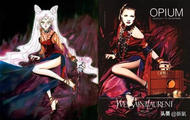 《美少女战士》中黑化小小兔Lady Black的原画大片,借鉴得就是Kate Moss香水广告大片。布景中的暗红缎面为暗黑淑女的质感更添一份诡艳美。
