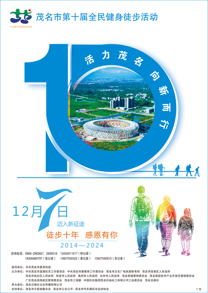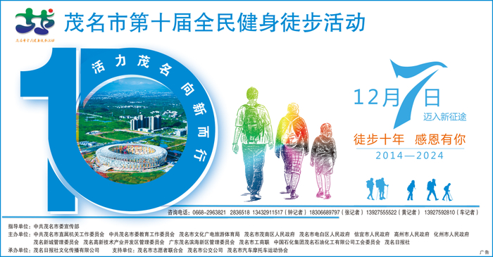 本届徒步活动适逢十周年,每一届活动都吸引了上万徒友参与,每一届活动都见证着茂名这座城市的发展蝶变。本届徒步活动继续秉承“全民健身与茂名发展同行”的宗旨,以“体育+”的形式,链接“百千万工程”“乡村振兴”“帮扶协作”“文旅融合”等工作,为广大市民群众打造一场高品质的都市生活运动盛宴。