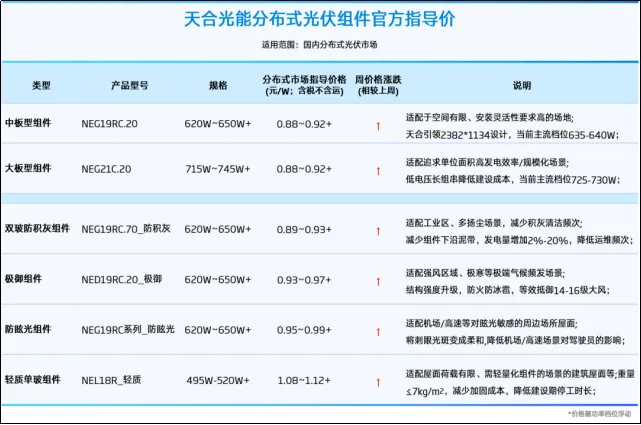 在上调3分/W后,天合光能最新的组件价格分别为:中版型、大版型组件价格为0.88-0.92+元/W,离1元/W的价格已经不远了;功能型组件价格稍高,防眩光组件0.95-0.99+元/W,轻质单玻组件1.08-1.12+元/W。
