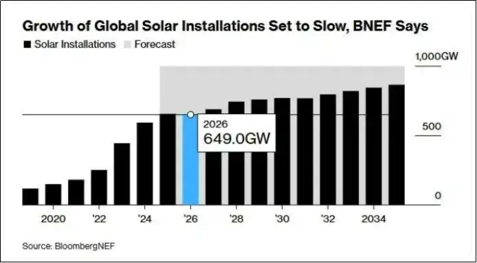 彭博新能源财经日前的报告也指出,受欧美政策调整、部分市场饱和及投资回报预期下降影响,2026年全球光伏新增装机量将出现自2000年有记录以来的首次年度萎缩。