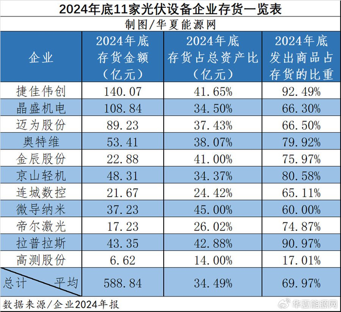 11家设备企业存货金额合计超过477亿元。这还是存货下降之后的结果——有媒体统计,2024年11家光伏设备企业存货金额高达589亿元,存货占总资产比例范均值35%。