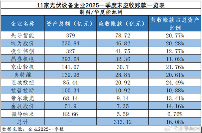 截至2025一季度末,11家光伏设备企业应收款合计313.12亿元,其中应收账款占到总资产的20%以上的就有5家,整体应收款占资产比例平均水平也达到16.08%。