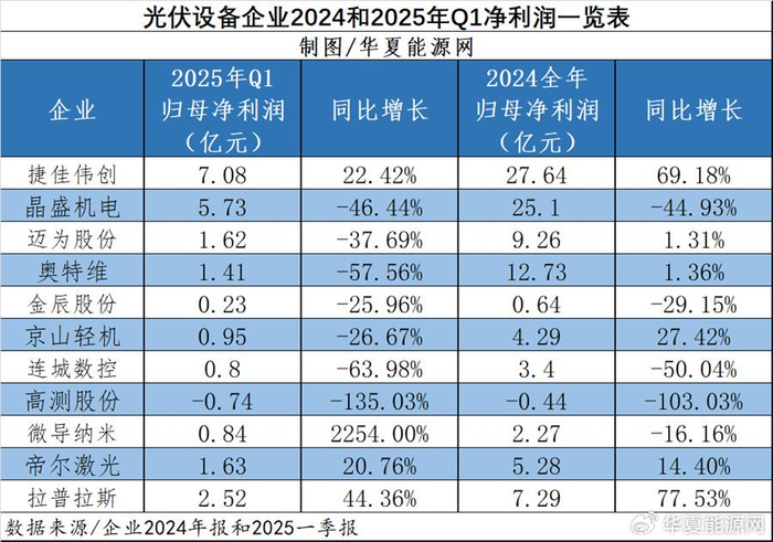 华夏能源网(公众号hxny3060)统计,2024年和2025年Q1,在A股市场的11家光伏设备企业中,有10家实现了盈利。同期,11家企业净利润合计分别为97.46亿元和22.07亿元,与主产业链企业一片亏损形成了鲜明对比。