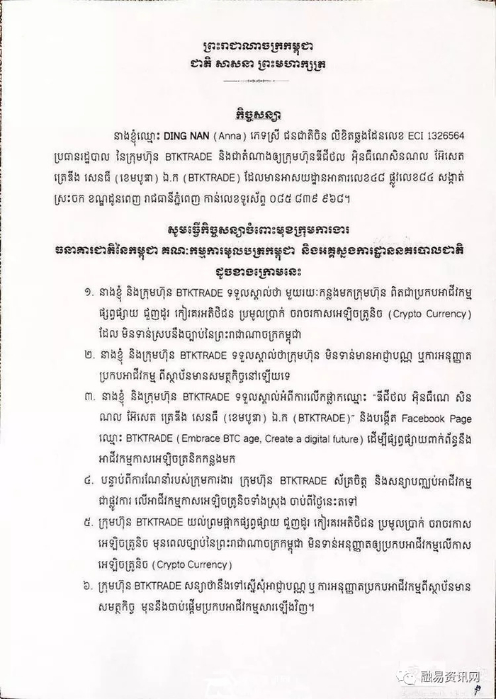 据保证书内容,柬埔寨国际数字资产交易所承认公司在柬埔寨的加密货币发行、交易和集资活动,违反了柬埔寨法律,承认公司是在没有获得相关部门批发营业执照和许可证情况下开展营业。柬埔寨国际数字资产交易所愿意在保证书签发日期起全面停业。