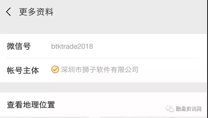 另一可疑信息是,之前据大象区块链报道,BTK 交易所经过微信官方认证的服务号“比特王(微信号 bittrade2018)”,其认证公司是深圳市狮子软件有限公司。因此该报道认定 号称柬埔寨第一交易所的 BTK 交易所,其主体实际是深圳市狮子软件有限公司。