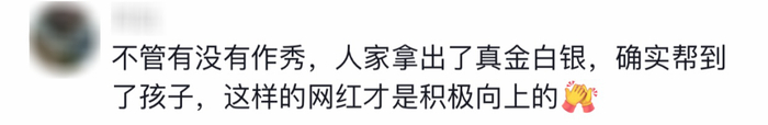他们表示,甭管这些网红的目的为何,只要切实帮助了孩子,就值得大家称赞表扬!