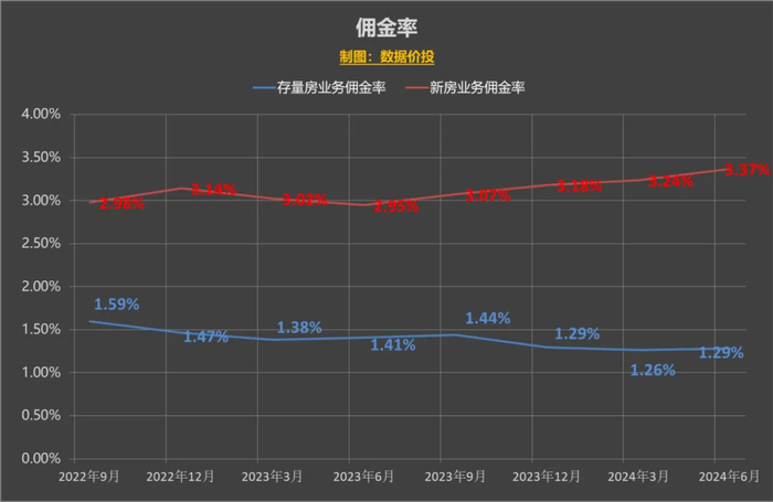 新房业务和地产行情的关联性明显更强,新房GTV下降了20.24%,新房收入下降了8.76%,而新房整体佣金率为3.37%,同比则反而有所上升;新房不好卖的情况下,给到贝壳经纪人的佣金率自然有所提升,但仍无法抵消新房销量的下滑。