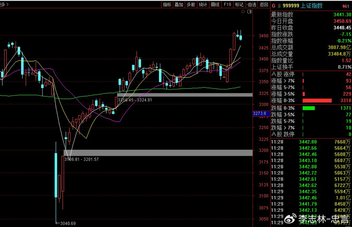 在我看来,这不是国家队在出货,而是为了控制大盘上涨节奏。这从上午个股涨跌比3696:1477悬殊涨多跌少便可知国家队是为了压指数,但是市场做多热情仍高。在3450-3430点一线,震荡洗盘、充分换手,以便让后势走的更稳。