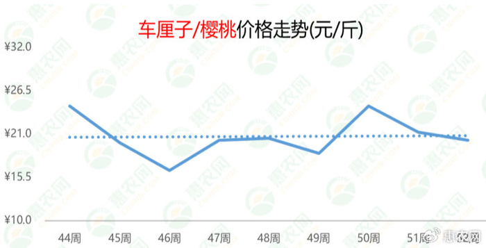 随着海运车厘子大量到货,价格继续下跌,但环比跌幅有所收窄。第52周,车厘子/樱桃的价格为20.2元/斤,较上周和去年同期分别下跌5%和58%。
