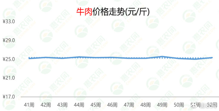本周,牛肉结束前2周的偏弱行情,周均价环比止跌上涨至25.4元/斤,较上周和去年同期分别上涨1%和8%。