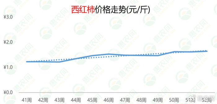 第52周,西红柿的价格为1.6元/斤,与上周相比上涨2%,与去年同期相比上涨36%。此轮价格上涨主要是11月产区冻害与12月北方降雪相继影响了采收,导致西红柿市场供应量下降,价格上涨。