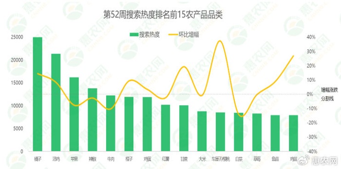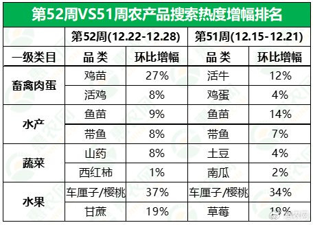 市场热门搜索品类的热度增幅方面,第52周,车厘子/樱桃继续领涨,搜索热度环比上涨37%,其次是鸡苗,搜索热度较上周上涨27%。