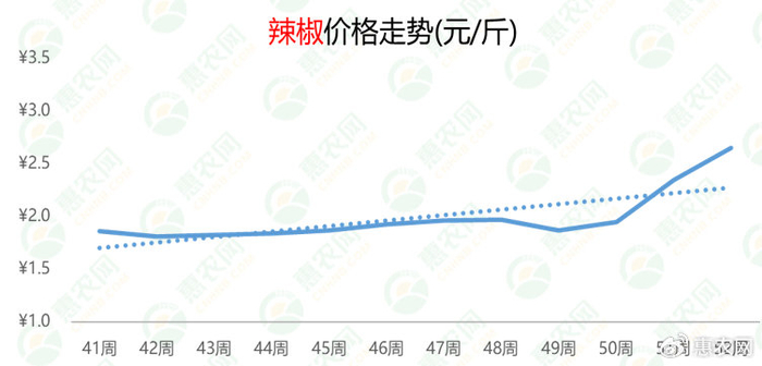 主产区小米辣减产,导致辣椒市场货源整体偏紧,价格连续3周上涨。第52周,辣椒的周均价为2.6元/斤,环比、同比分别上涨13%和59%。