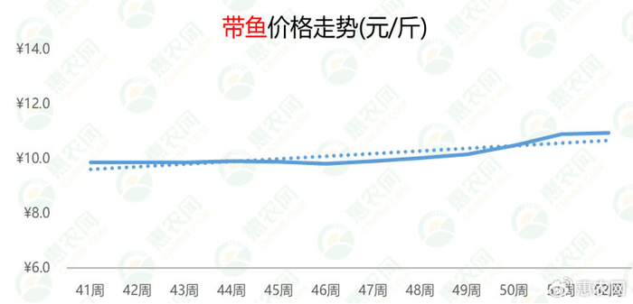 从周均价走势来看,带鱼价格在上涨至高点后开始逐步趋稳。第52周,带鱼的价格维持在10.9元/斤,环比基本持平,同比上涨17%。