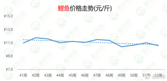 受市场终端消费乏力的影响,鲤鱼的行情暂难继续上涨。本周,鲤鱼的价格为10.6元/斤,环比、同比分别下跌4%和6%。