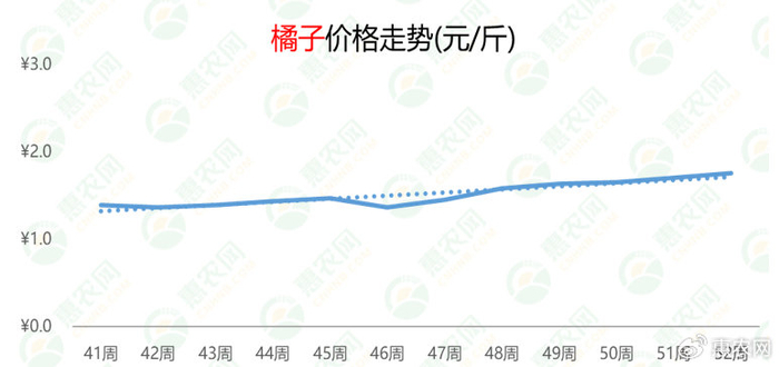 橘子市场热度持续升温,价格同步跟涨。第52周,橘子的价格为1.8元/斤,环比上涨3%,同比下跌8%。