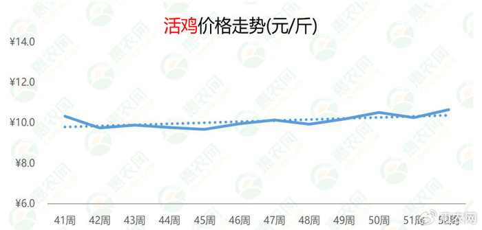 近期,活鸡价格波动频频,周均价有涨有跌。第52周,活鸡的价格为10.7元/斤,环比、同比分别上涨4%和27%。