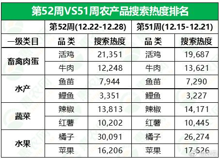 据惠农网平台对畜禽肉蛋、水产、蔬菜和水果4大农产品类目的重点监测与追踪,第52周,畜禽肉蛋、水产、蔬菜和水果排名前2位的品类与上周相重叠,但搜索热度均有所调整:畜禽肉蛋方面,活鸡热度持续升温,牛肉热度出现下滑;水产排名前2位的品类热度全线飘红;蔬菜排名前2位的品类热度同步走低;水果方面,橘子较前一周更受追捧,而苹果热度有所回调。