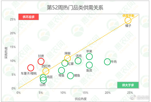 分析惠农网平台热门品类的供需关系:甘蔗和车厘子/樱桃的供应相对偏紧;橘子、辣椒和西红柿的供需相对均衡;山药、鸡苗、带鱼和红薯等9个品类的供应相对充足。