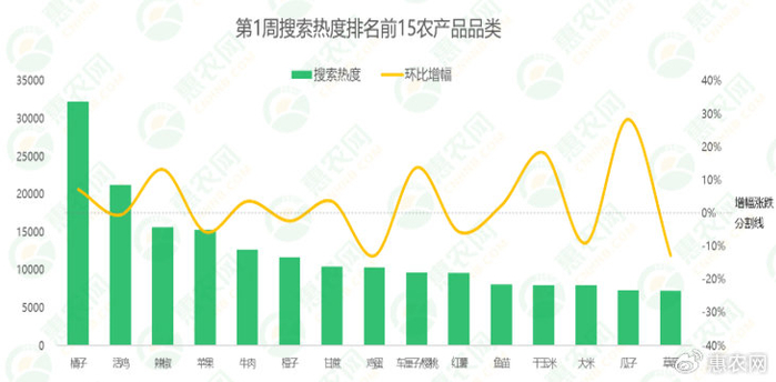 从环比增幅来看,第1周排名前15的农产品品类的市场关注度涨跌基本持平。橘子、辣椒、牛肉、甘蔗和车厘子/樱桃等8个品类的搜索热度实现增长,活鸡、苹果、橙子、鸡蛋和红薯等7个品类的搜索热度有所下滑。具体细分到品类,瓜子的市场关注度增幅较为靠前,环比上涨28%;而鸡蛋和草莓的市场关注度出现明显下滑,环比跌幅均为13%。