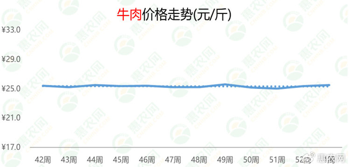 本周,牛肉价格稳中略有上涨,周均价为25.5元/斤,环比上涨0.5%,同比上涨8%。