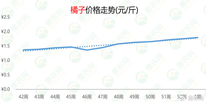 惠农大数据显示,橘子近3个月行情整体走势向好,本周延续涨势,周均价为1.8元/斤,环比上涨2%,但同比下跌2%。