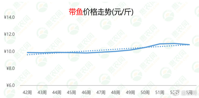 带鱼市场行情在上涨至阶段性高点10.9元每斤后开始掉头向下。本周,带鱼的价格为10.8元/斤,环比跌幅为1%,同比涨幅为24%。