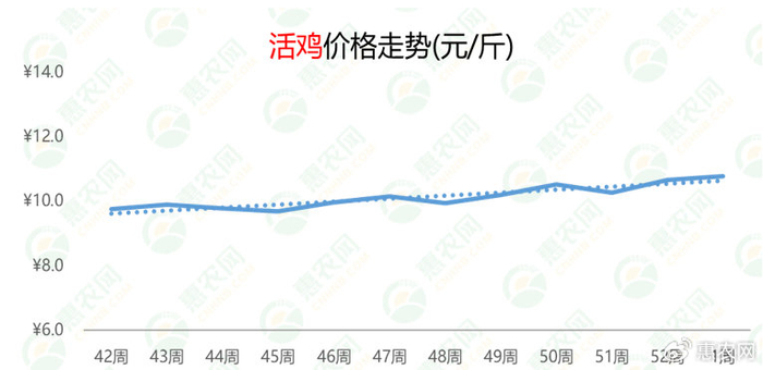 10月中旬至12月下旬,活鸡的价格呈现震荡上行态势,价格从9.8元/斤攀升至本周的10.8元/斤,上涨了1.0元/斤;从涨幅来看,较上周和去年同期分别上涨1%和25%。