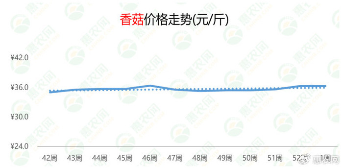 与辣椒的行情不同,香菇的价格较为平稳。第1周,香菇的价格为36.3元/斤,环比基本持平,同比下跌1%。