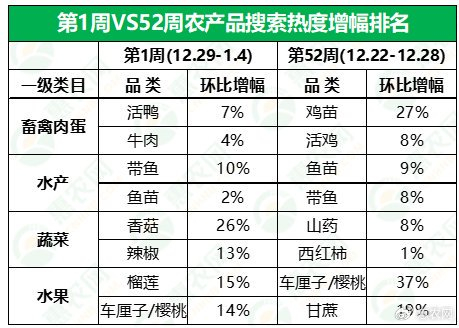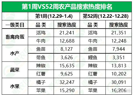 据惠农网平台对畜禽肉蛋、水产、蔬菜和水果4大农产品类目的重点监测与追踪,第1周,畜禽肉蛋、蔬菜和水果排名前2位的品类与上周保持一致,仅水产的排名有所调整:鱼苗排名稳居榜首,带鱼超过鲤鱼跃居至榜单第2位。