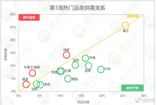 分析惠农网平台热门品类的供需关系:辣椒、车厘子/樱桃和榴莲的供应相对偏紧;橘子的供需相对均衡;香菇、带鱼、鲤鱼和红薯等9个品类的供应相对充足。