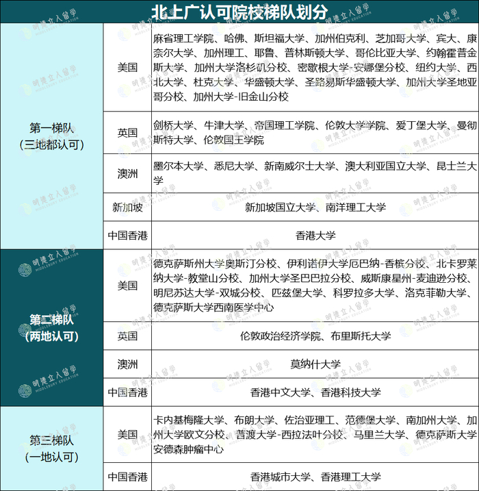 为了帮助大家更直观的了解“英美港澳新”院校在北上广的认可情况,小德特意为大家制作了以下表格——
