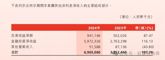 其中,其他非利息净收入为69.65亿元,同比增长107.76%,主要由交易收益净额增长87.47%和金融投资净收益增长116.13%所驱动。
