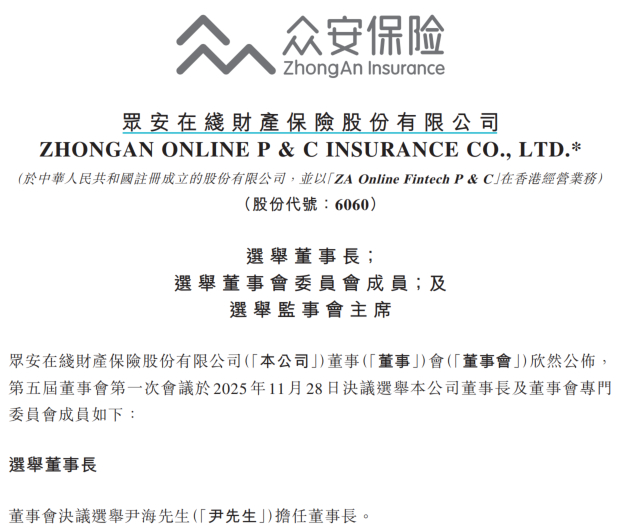 近日,众安在线发布公告称,第五届董事会第一次会议选举尹海担任董事长,任期三年,自2025年11月28日起至2028年11月27日止。