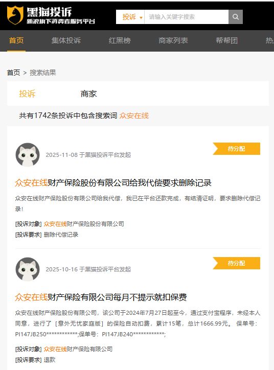 据黑猫投诉[下载黑猫投诉客户端]平台显示,截止2025年12月3日,通过检索“众安在线”关键词,涉及1700余条投诉,表明其销售规范、信息披露、客户服务等内部流程可能仍存在系统性问题。随着监管趋严,众安在线原有增长路径恐难以为继。