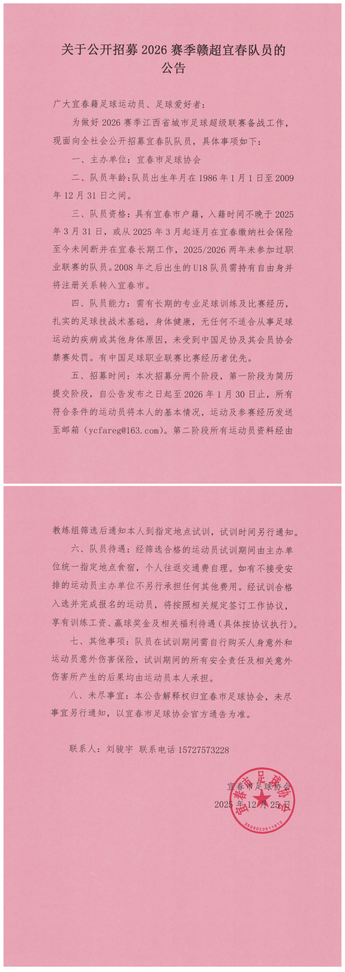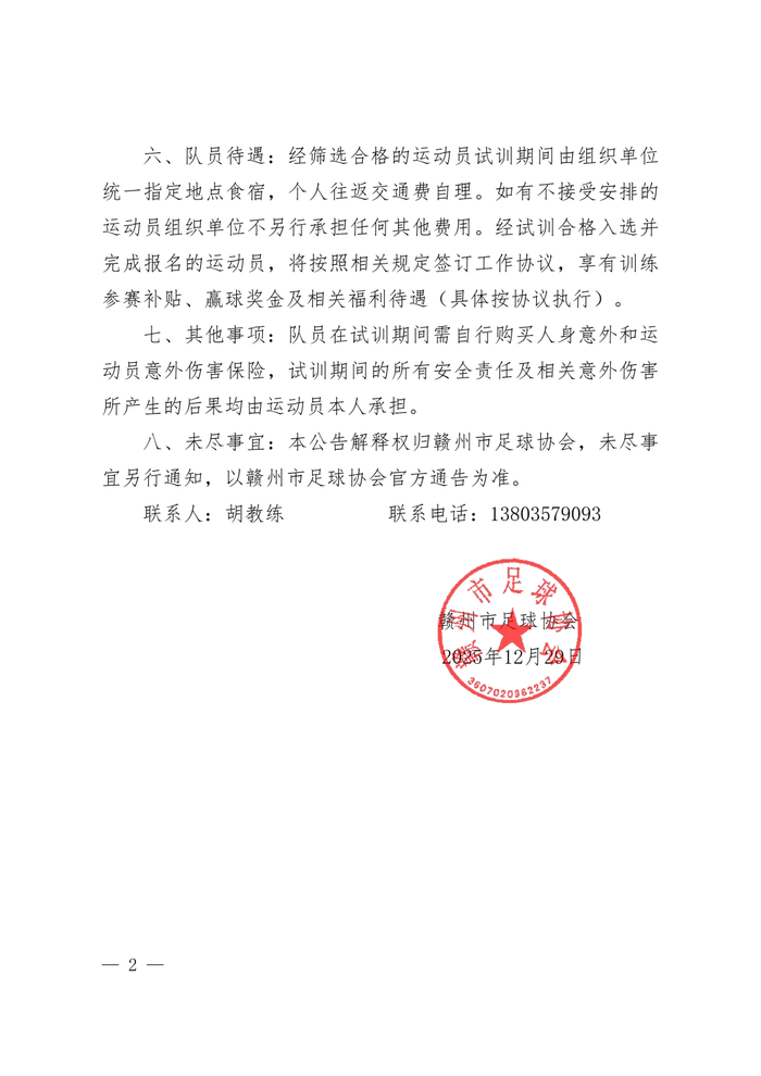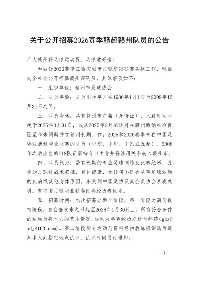 第一阶段:报名与初选(即日起—2025年12月31日)请符合条件的运动员,将以下材料以附件形式发送至招募专用邮箱:(邮件主题格式:姓名+年龄+位置,例:李四-28岁-中场)。所需材料:个人简历(含联系方式)、身份证件扫描件、足球履历(训练及参赛经历、所获荣誉)、相关资格证明(户籍/社保证明、自由身证明等)。