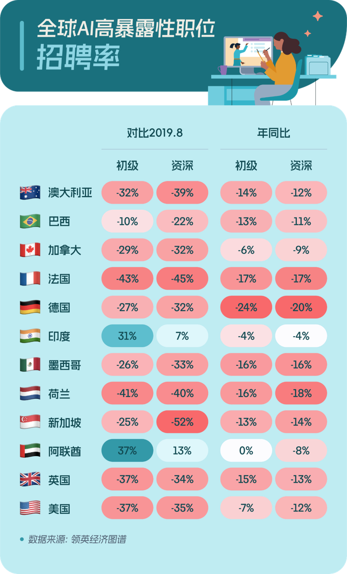 此外,领英还对比了澳大利亚、巴西、加拿大、法国、德国、墨西哥和新加坡等多个国家的数据。与疫情前相比,这些国家的整体招聘需求均呈下降趋势,而在AI高暴露性职业中,资深岗位需求的降速则普遍比入门级岗位还要高。因此,初级岗位招聘需求的降低很可能是由宏观经济环境造成的,而非仅仅是AI的锅。