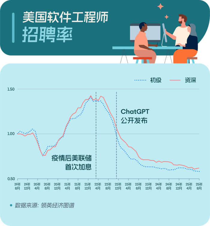 事实上,美国市场对于软件工程师人才需求的放缓自2022年8月就开始显现,早于AI爆发的关键节点——2022年11月ChatGPT的发布以及消费级生成式人工智能开始广泛应用。领英数据显示,市场需求在美联储宣布加息后达到顶峰,其后不久,软件工程师的招聘速度便大幅放缓至疫情前水平,而2022年11月之后的放缓幅度反而有所减小。