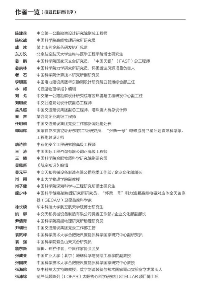 《大国重器》作者一览表为了拉近读者与陌生科学名词的距离,行文采用的是问答形式。中国为什么要建自己的空间站?什么是纳米?“蓝鲸 1 号”开采的可燃冰为什么这么重要……在深入浅出又不失严谨的回答中,读者可以获得对我国最新前沿科技全方位的充分认知。