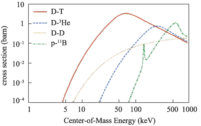 图2 几种主要的聚变反应截面(D-D,D-3He,D-D,p-11B)以及最大反应截面所对应的温度(keV)