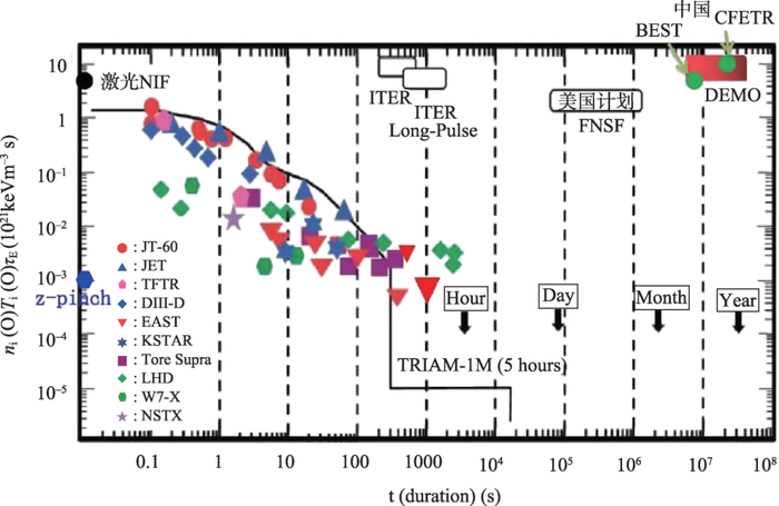 聚变研究的最重要的目标就是实现聚变发电。对于未来聚变发电,不但要稳定、可靠、重复地实现高效点火,同时还要长时间地实现对燃烧等离子体进行约束和控制。而对聚变堆所需的燃烧等离子体长时间约束和稳定控制则难度更大。图9 是聚变各种途径活动的聚变等离子体三重积的数值和持续的时间。惯性约束尚未实现重频连续放电,磁约束聚变的结果显示,随着等离子体持续时间延长,等离子体的性能在不断下降,图9 中右上角是未来聚变实验堆和示范堆所需的三重积和持续时间。数据清楚地表明,我们目前与这个目标参数差距依然很大。