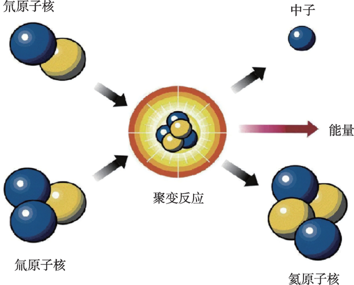 核聚变,又称核融合、融合反应、聚变反应或热核反应,即两个较轻的核结合而形成一个较重的核和一个极轻的核(或粒子)的一种核反应形式,原理如图1 所示。质量小的原子,在一定条件下(如超高温和高压),能让核外电子摆脱原子核的束缚,两个原子核能够互相吸引而碰撞到一起,发生原子核互相聚合作用,生成新的质量更重的原子核,中子虽然质量比较大,但是由于中子不带电,因此也能够在这个碰撞过程中逃离原子核的束缚而释放出来,大量电子和中子的释放所表现出来的就是巨大的能量释放。